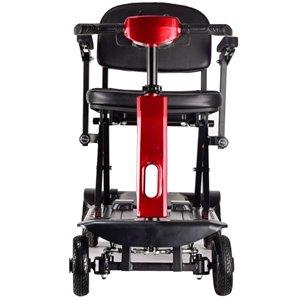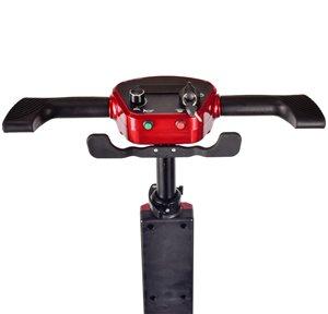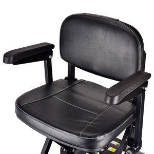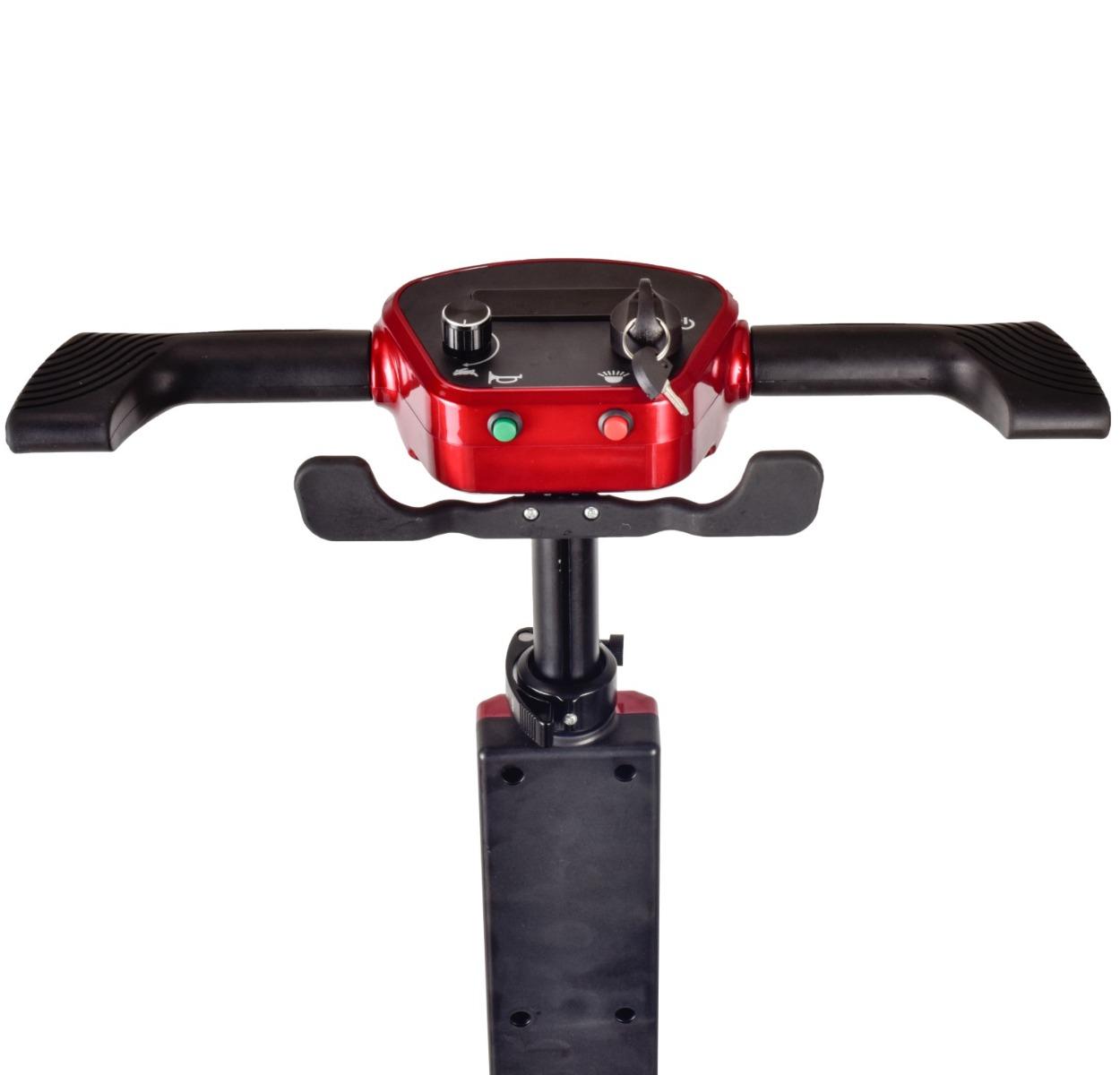 The battery is easily removeable so can be removed for convenient charging. It has all the features you would expect such as simple controls with one large lever to go forward and one to go backward. When the lever is released the brake automatically comes on so it will not roll forwards or backwards unintentionally. It can climb up 12 degrees and has rear anti roll safety wheels so will not tip back. The handlebar height is adjustable and the range per charge is 10-15km.